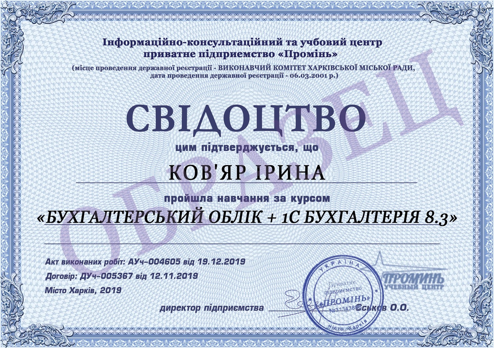 Документ о прохождении курса "Бухгалтерский учет + Бухгалтерия 1С 8.3". Выпускница - Ковьяр И.Н. Выпуск - декабрь 2019.